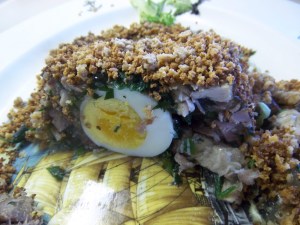 As usual, when I complete a part of the book I give you the stats for the section.[2] Cured Meat scored a mean of 7.53, putting it on level pegging with Pork and Poultry. The median score was 8, and there were two modes: 7 and 8.5. The only significantly better scoring section of the Meat, Poultry and Game chapter thus far is the section on Meat Pies and Puddings.