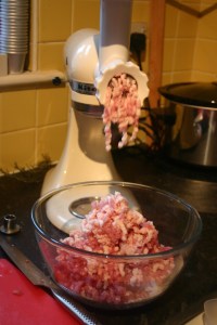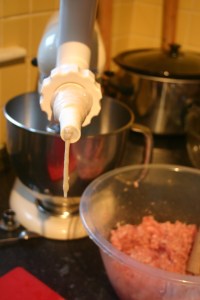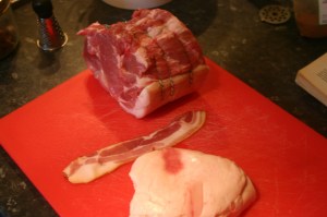 I remember putting off any of the curing for a good while, fearing it slightly, but eventually I had to put my trust in Jane and her instructions. Of course, everything worked. Whenever things went awry, it was due more to my naivety than anything: for example, I used joints that were far too small to poach successfully; luckily I now know to cook as large a piece as possible, and pot what isn’t eaten in the next couple of days. Jane also taught me the importance of aromatics: cures are not simple brines, but they are flavoured with dark brown sugar, juniper, bay, allspice and nutmeg (to name but a few). The only thing I haven’t taken with me is the liberal use of saltpetre. Also going by the name potassium nitrate, saltpetre cures meat well and also gives the meat a nice pink colour, but there are associations with whole a host of diet-based diseases, so these days I miss it out. I don’t mind my bacon being a little less pink.[1]
