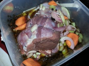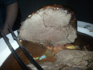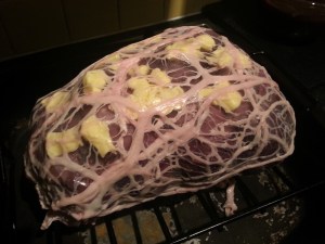 My joint weighed in at 2 kg, so I did the same as Jane describes, except for two things: because the joint wouldn’t be in the oven as long, I preheated it to 230°C, roasted it for twenty minutes, and then turned it down to 190°C, and roasted it for 1 ¼ hours. As it turned out, it was perhaps in the oven too long, because there was just the merest sign of pinkness. Sixty or sixty-five minutes would have been better to suit my tastes.