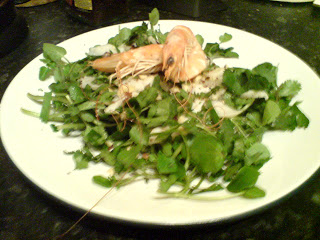 Arrange some salad leaves – I used rocket – on four serving dishes, place the scallops on top, and spoon the sauce into little ramekins. Eat immediately.